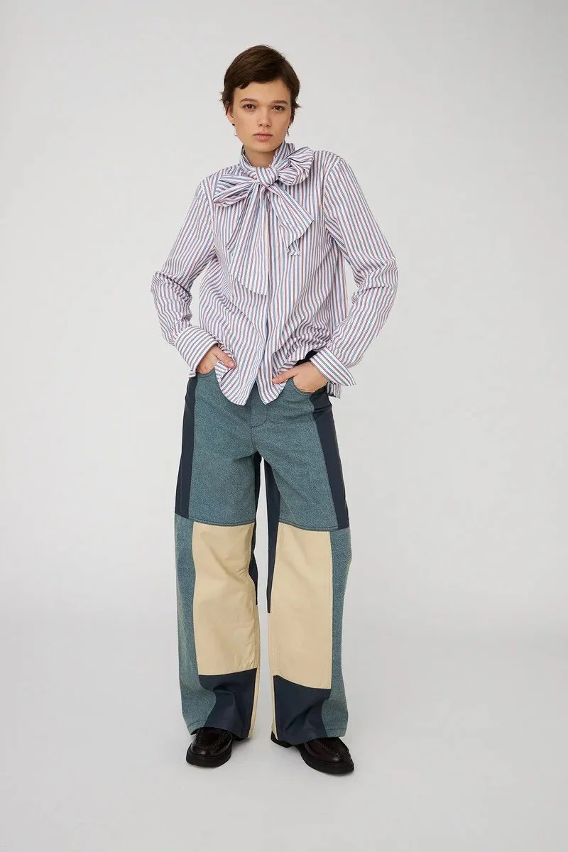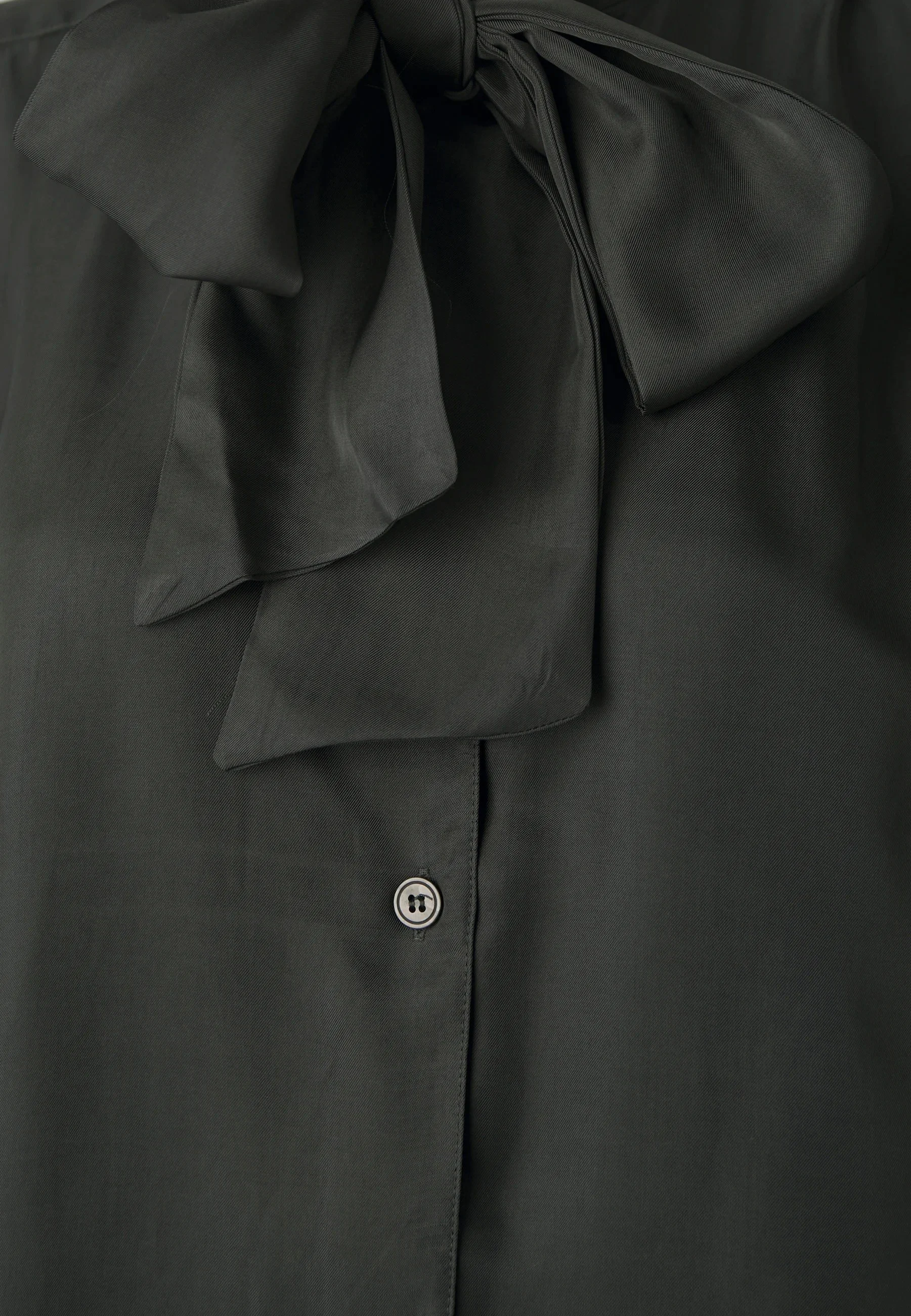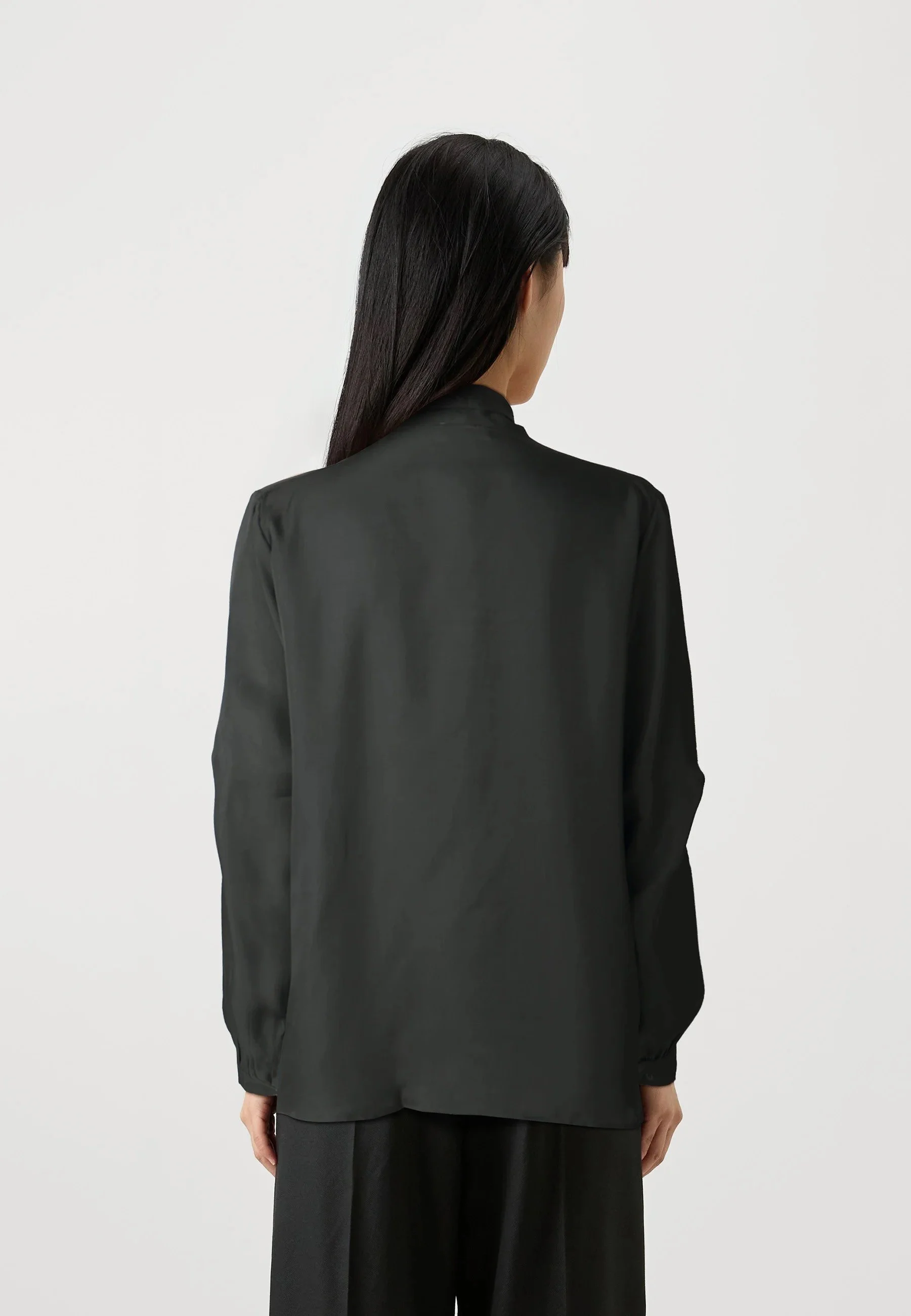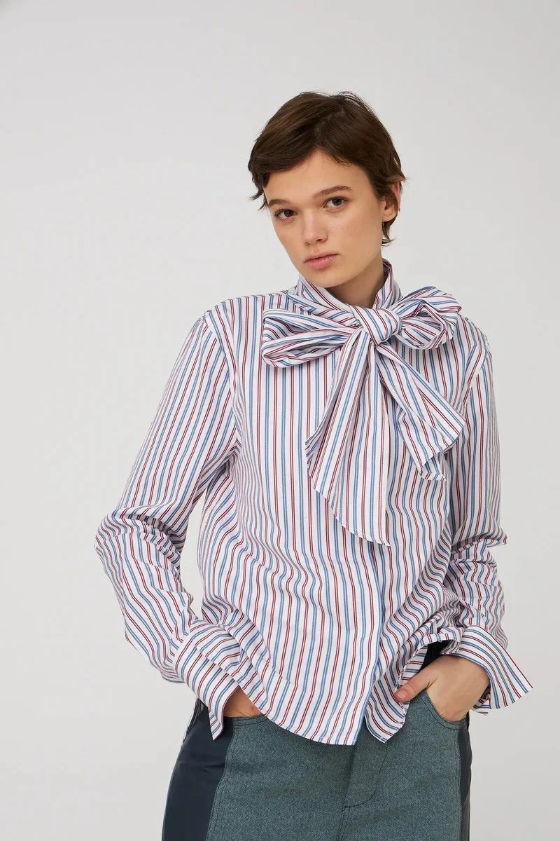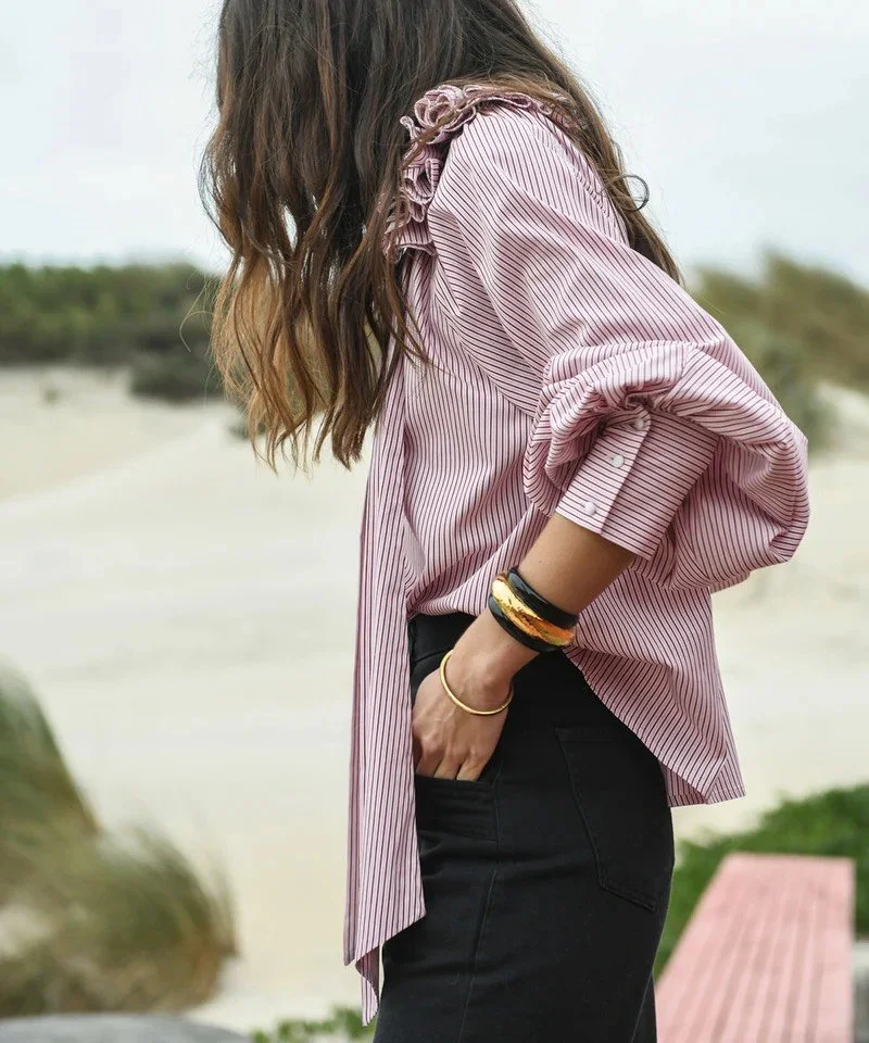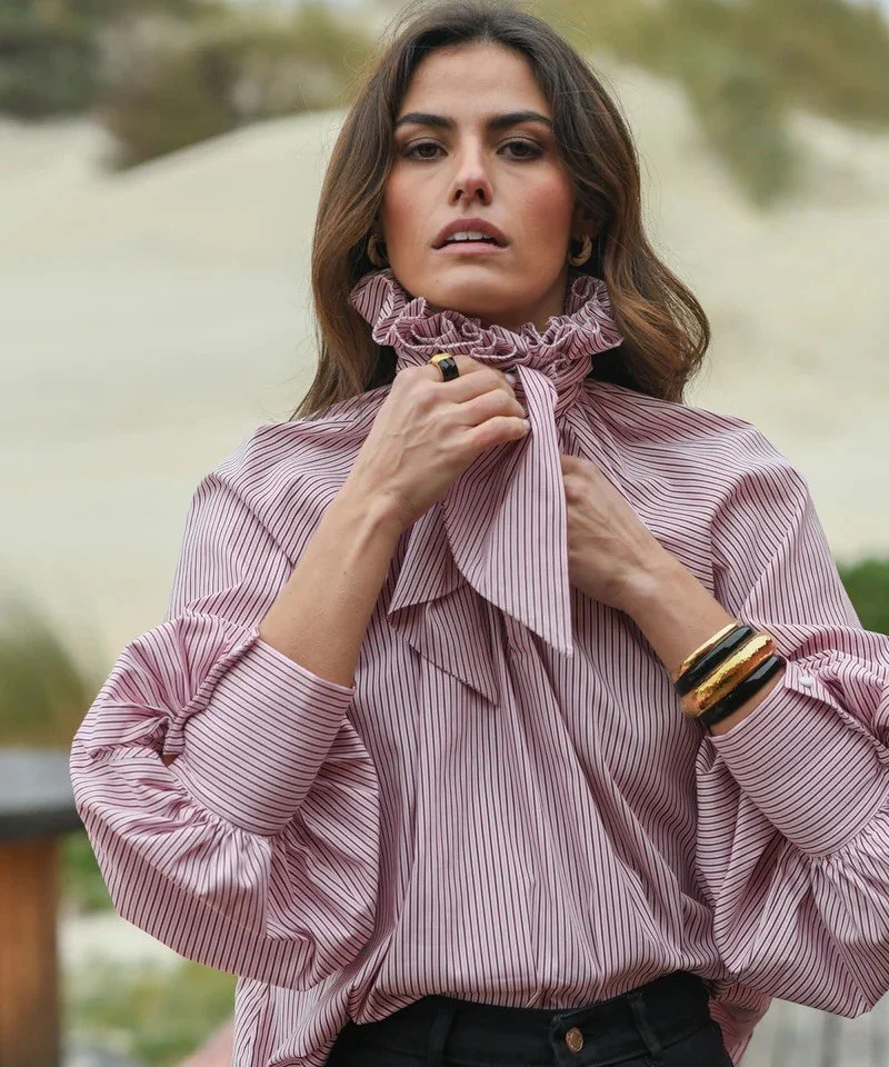 La camisa presenta un corte corto (cropped) y está confeccionado en 100% lino, un tejido ligero y transpirable. Cuenta con mangas amplias a media longitud con diseño en capas y un escote redondo.