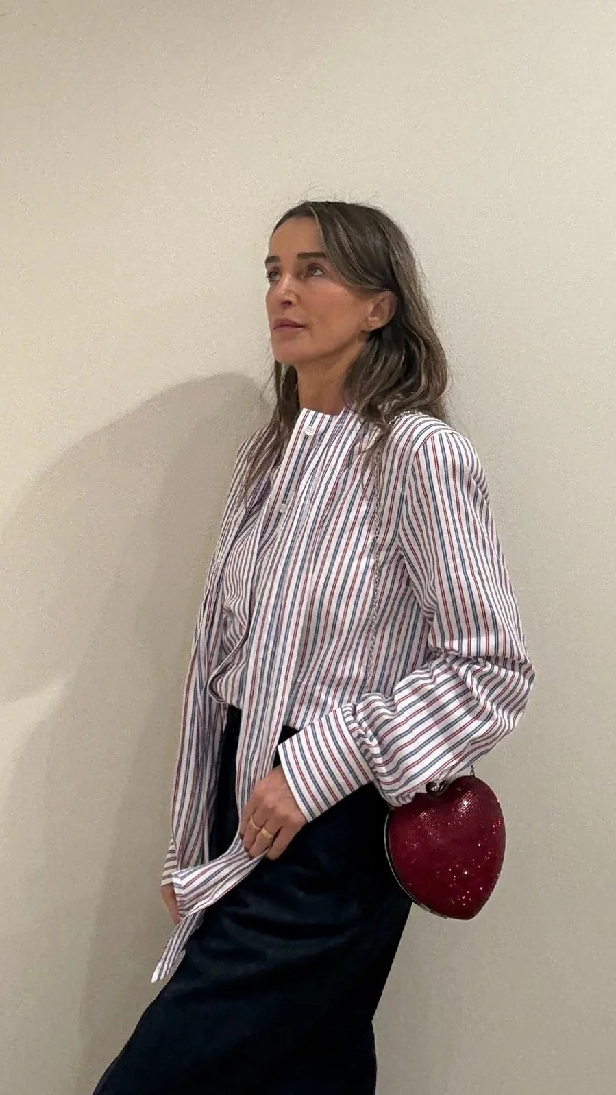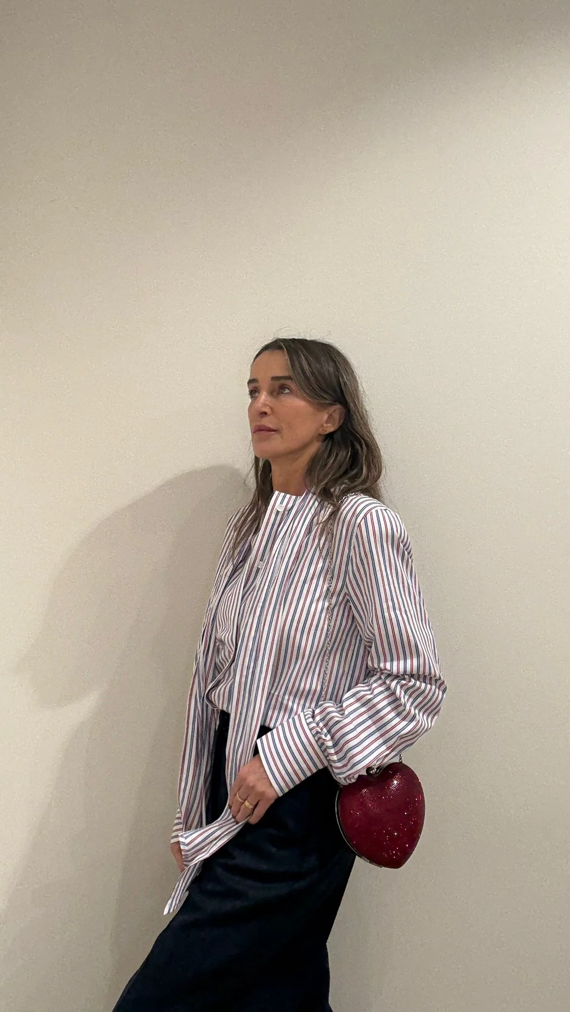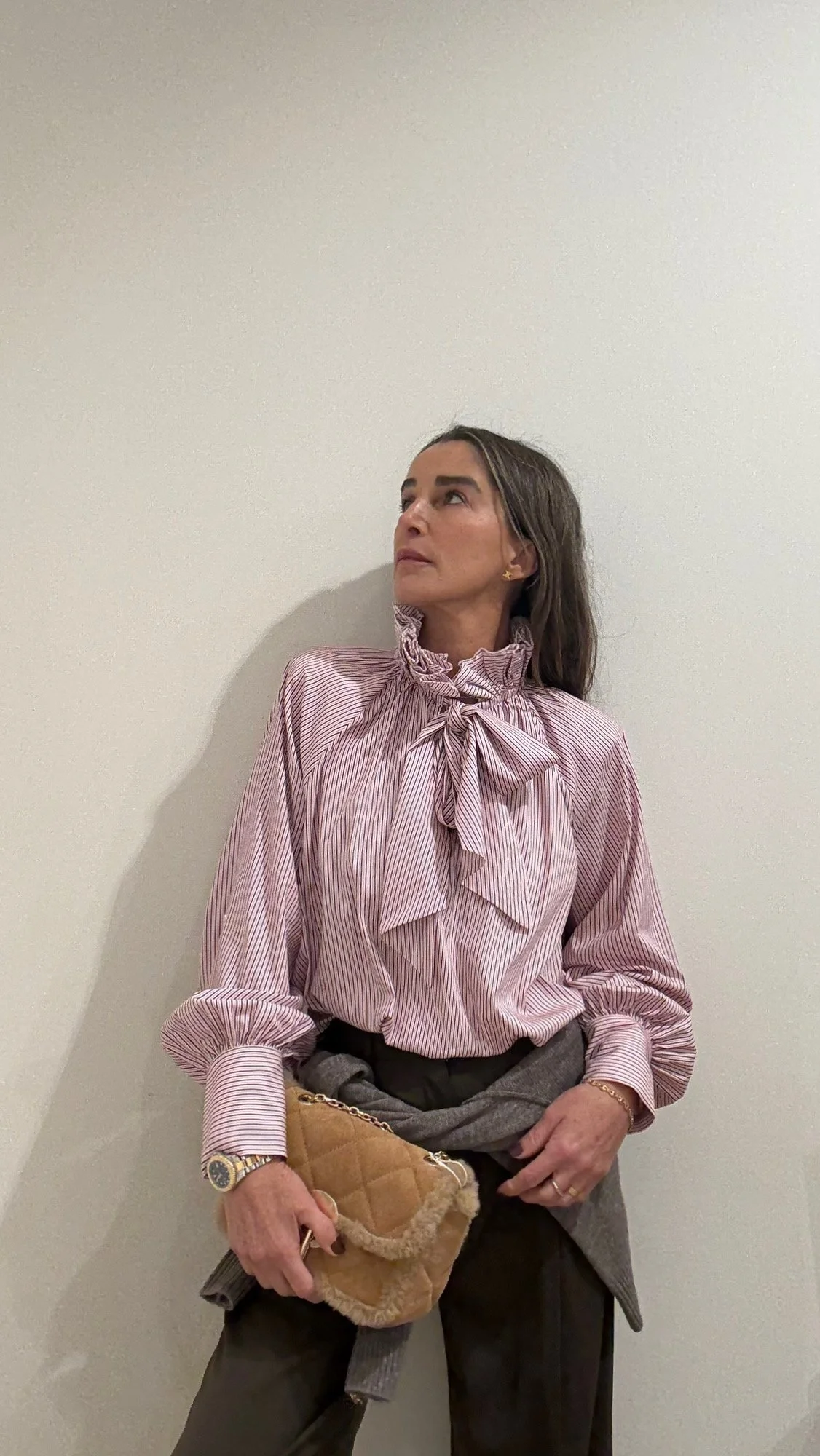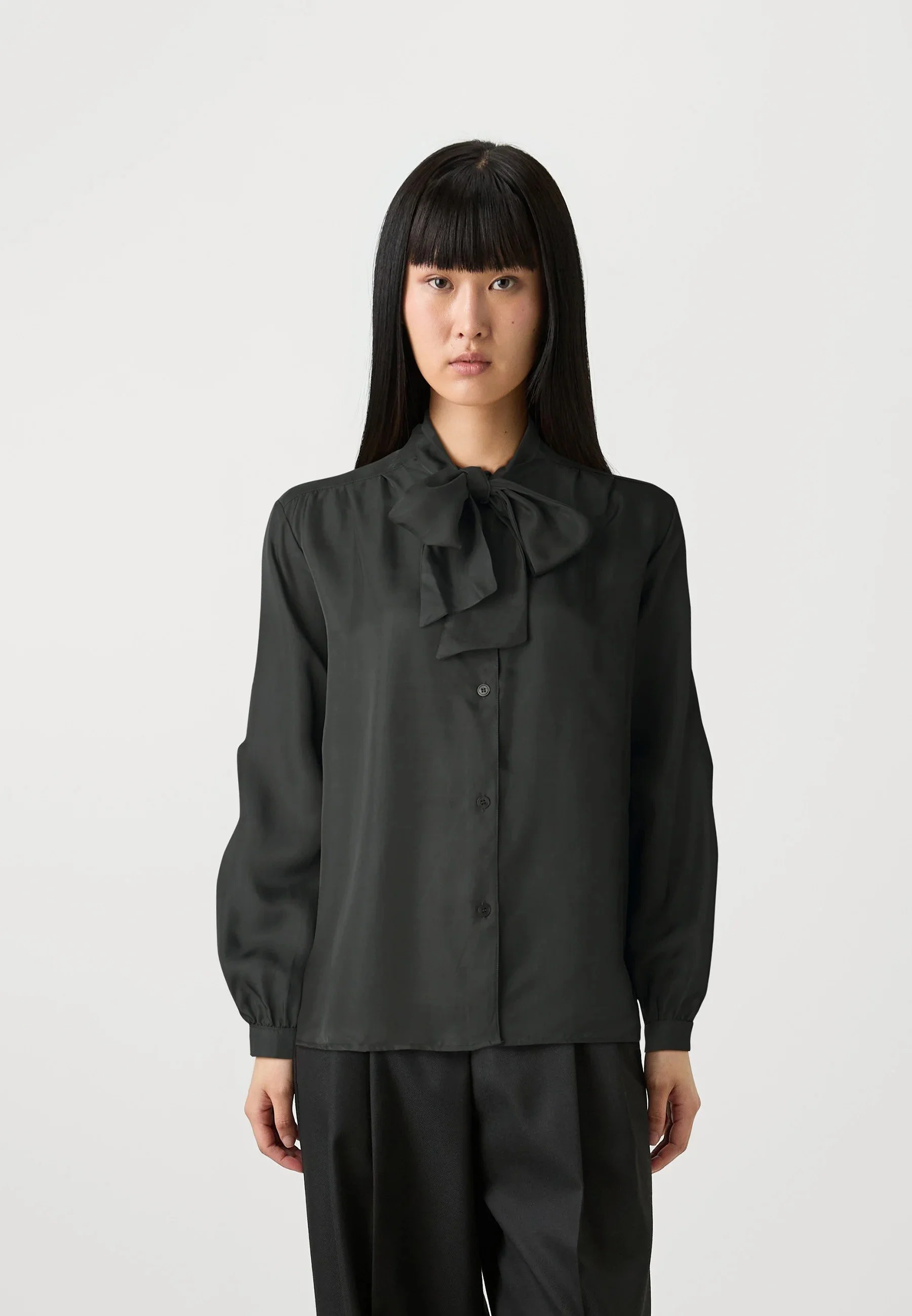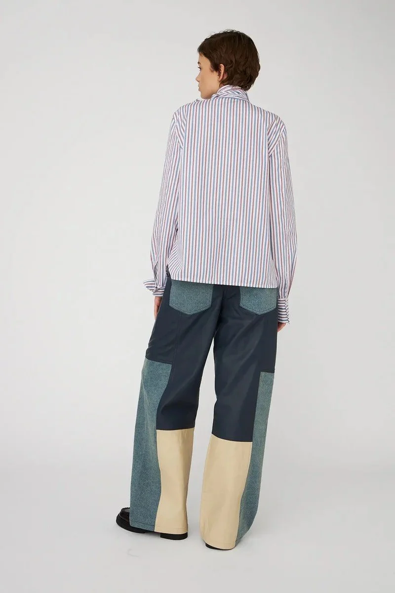 La camisa presenta un corte corto (cropped) y está confeccionado en 100% lino, un tejido ligero y transpirable. Cuenta con mangas amplias a media longitud con diseño en capas y un escote redondo.