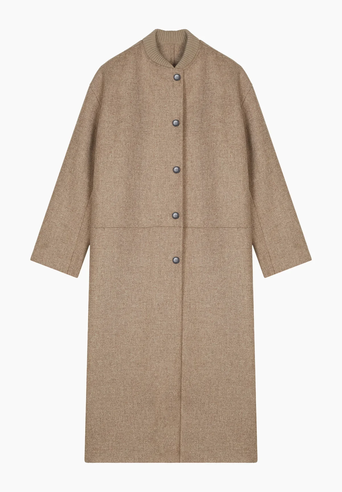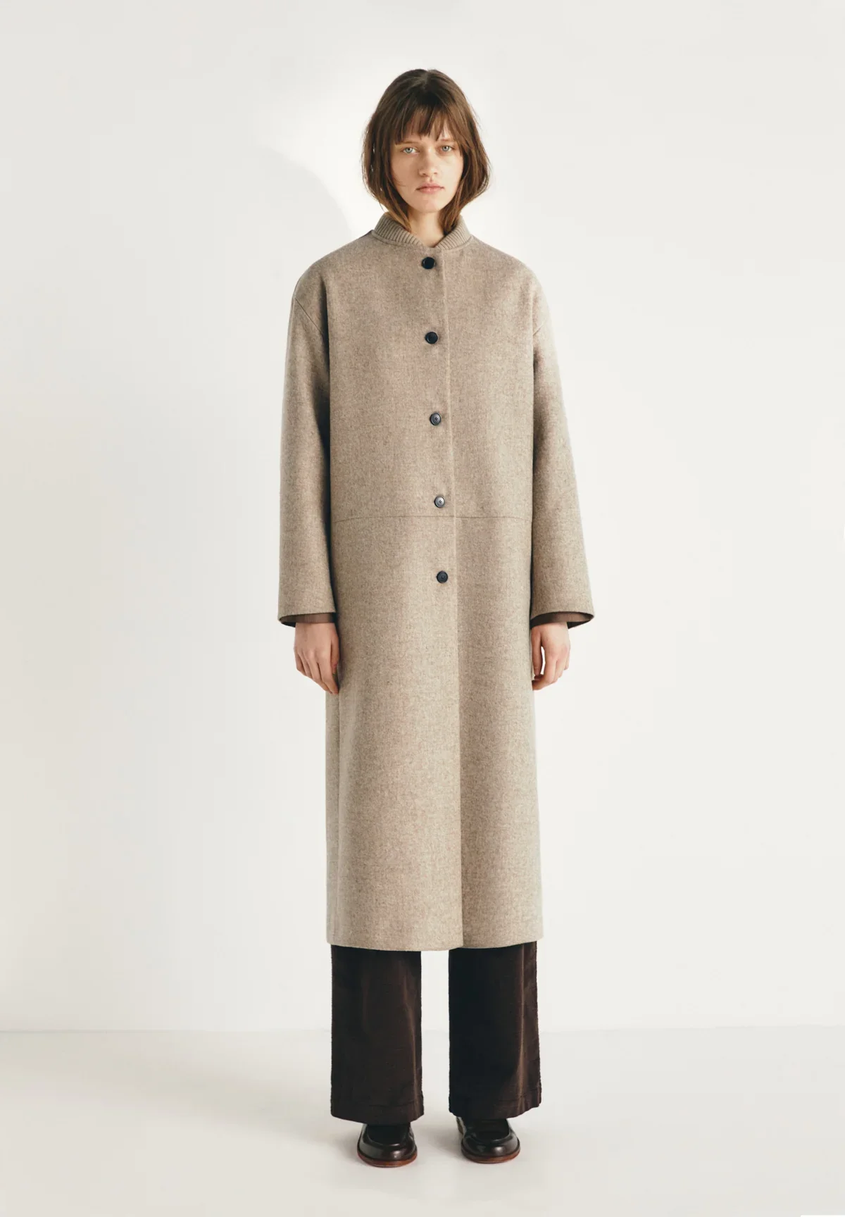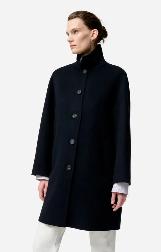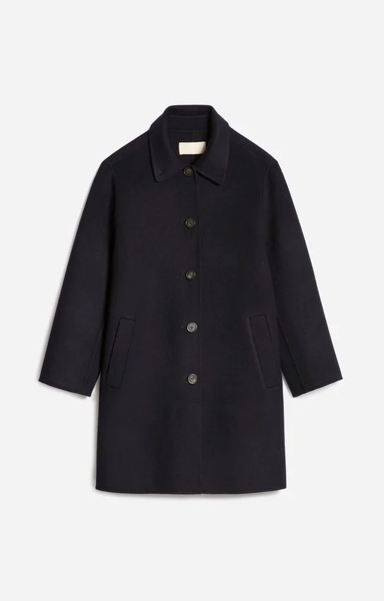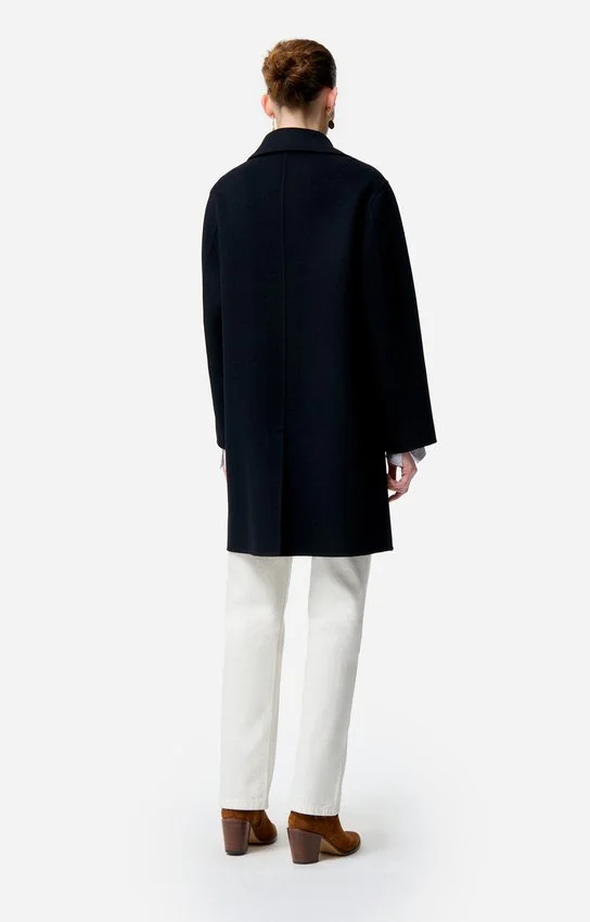 Este abrigo tiene un corte clásico con una silueta redondeada en los hombros. Está confeccionado en lana melton reciclada con una superficie cepillada. Elaborado a partir de una mezcla que incorpora materiales reutilizados de la producción de FILIPPA K.