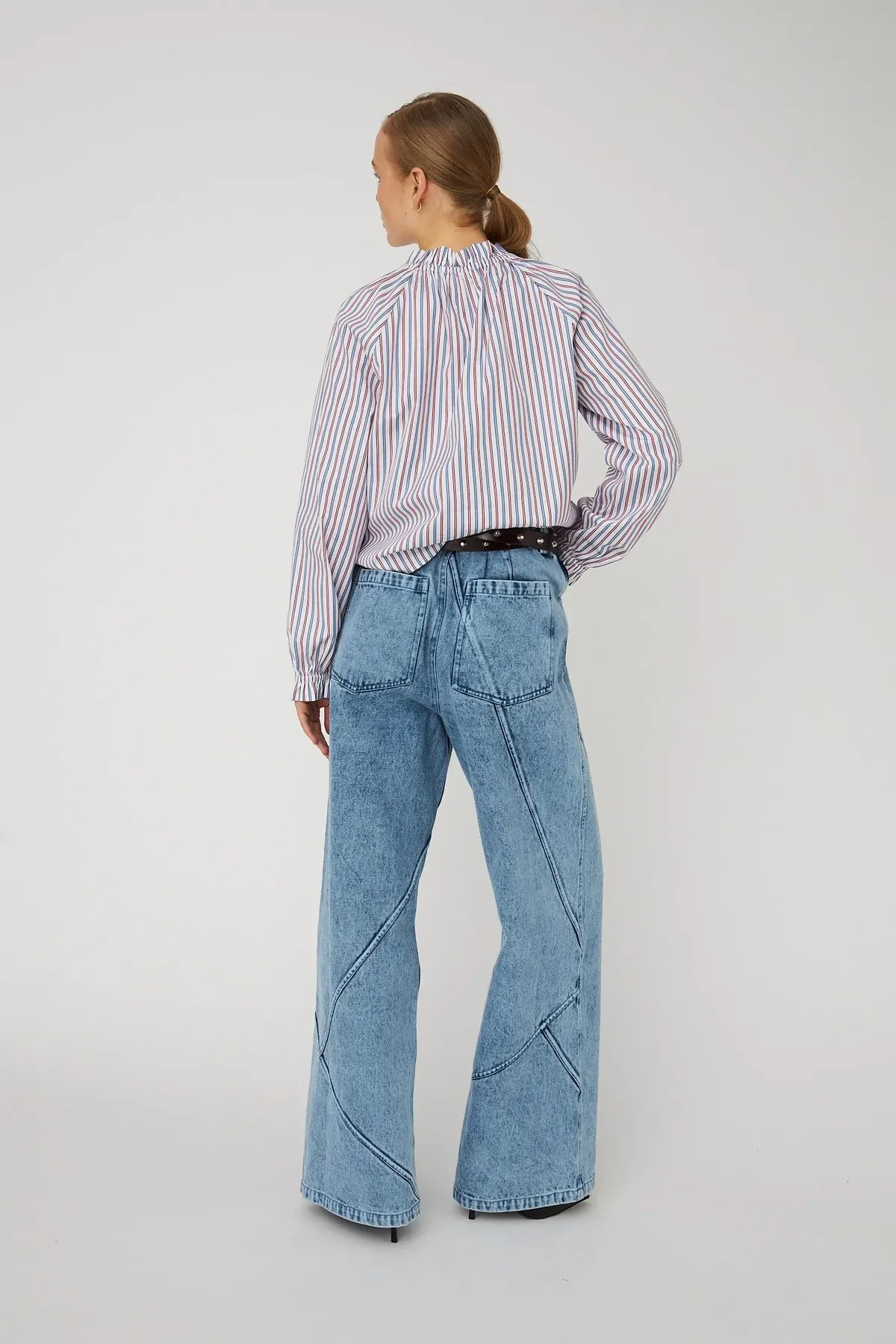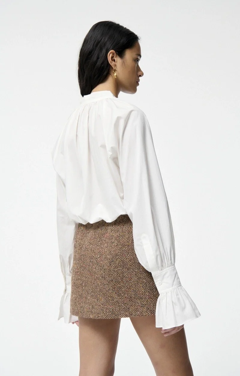 Camisa ligera de algodón con lazo en el cuello y bordado de lápices. La camisa tiene botones en la parte delantera central y mangas largas con puños abotonados.