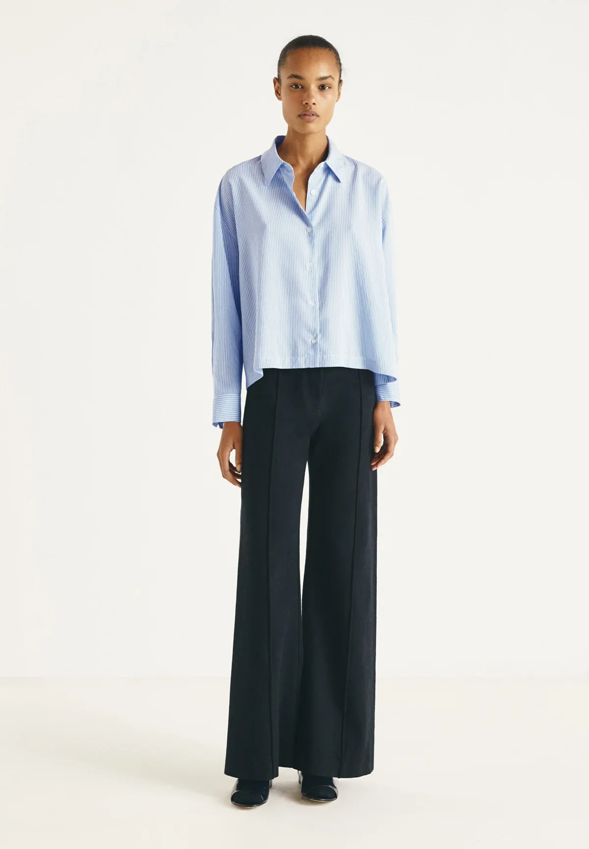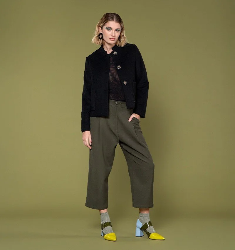 Con su corte ligeramente acampanado, los pantalones Belita crean una silueta elegantemente alargada. Confeccionados en un estructurado cuero de cabra aterciopelado, encarnan un espíritu revisitado de los años 70. Su cintura alta realza la figura, mientras que sus meticulosos acabados los hacen fáciles de combinar con todo, desde el vestuario de oficina hasta los looks de fin de semana.