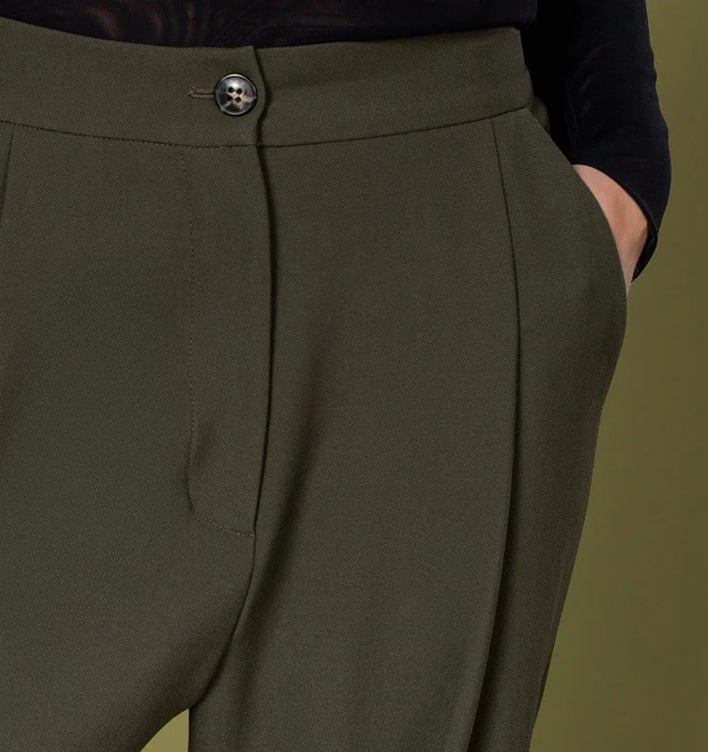 Corte acampanado de talle alto. Cierre de botón y cremallera, bolsillos delanteros inclinados, bolsillos de parche en la parte trasera trabillas